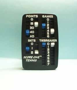 Attention Competitive Tennis Players of All Ages! If you have ever had difficulty keeping track of your score, then SCORE ONE®; is for you! SCORE ONE is the personal hand-held scoring device. SCORE ONE fits comfortably in the palm of your hand. Adjust the score with the touch of a finger. SCORE ONE is light, easy to hold, extemely durable and comes with a generous warranty. SCORE ONE fits in a tennis player's pocket for easy access and use while playing or watching a match. SCORE ONE is available with a convenient clip for easy access during the game. The numbers are large and easy to read. No batteries required. SCORE ONE includes information on how to score a tennis match.